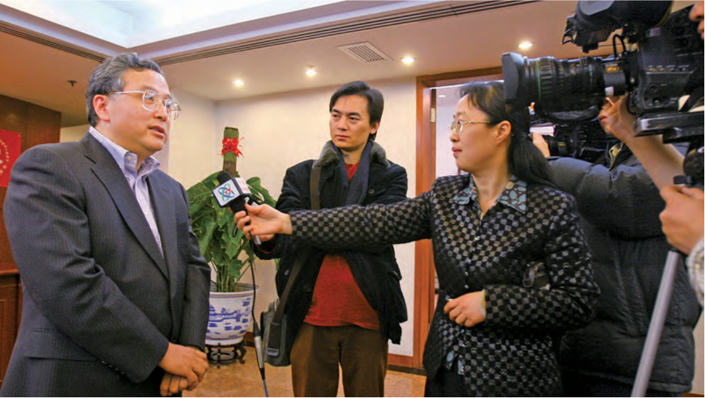集团总部为抗击地动灾难捐钱, 党委副书记、总司理刘毅接受央 视采访